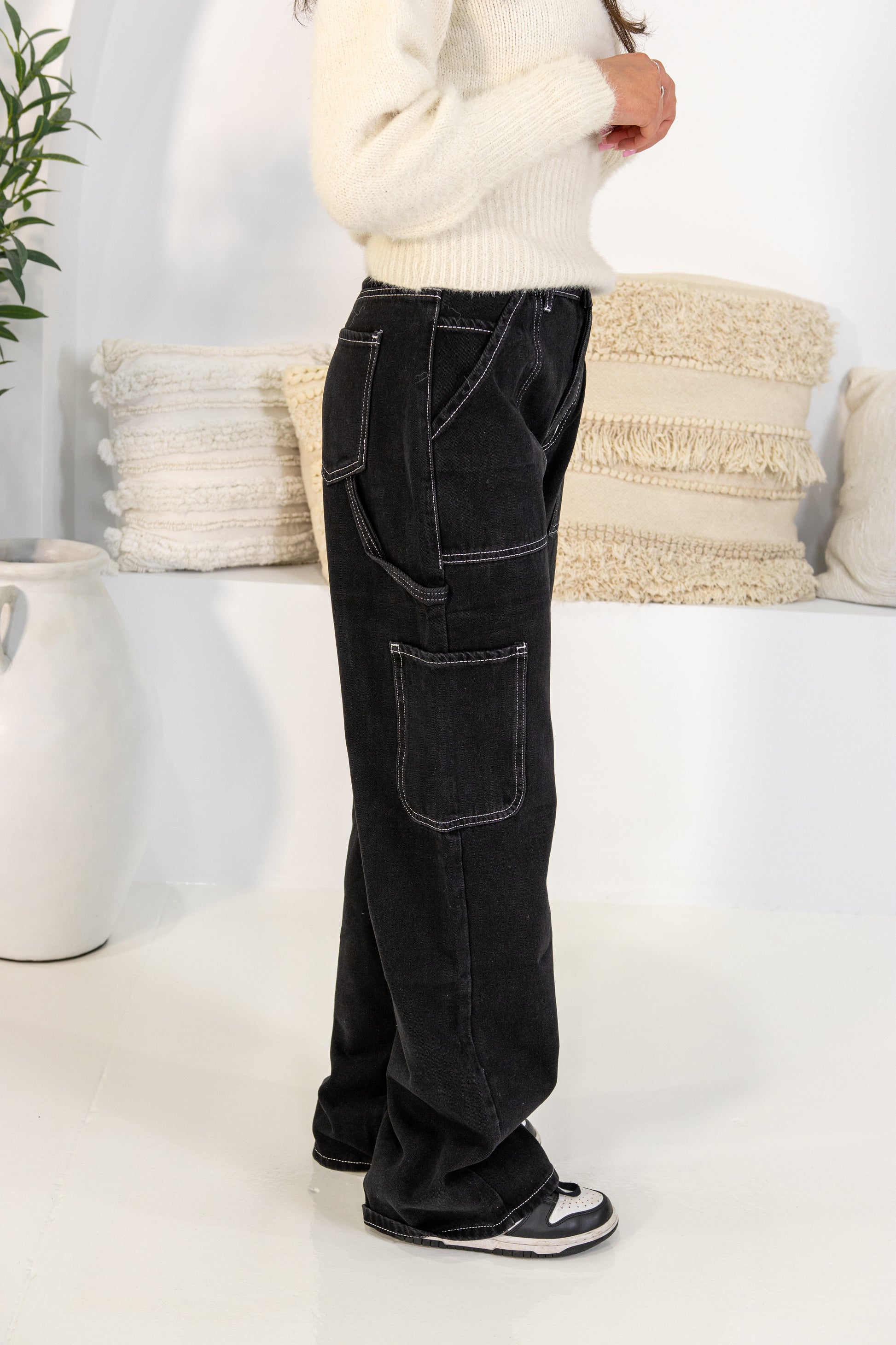 These jeans feature a high-waisted fit with bold white contrast stitching and utility-style panel detailing for a modern, elevated look. The flattering straight-leg cut makes them easy to dress up or down for any occasion.