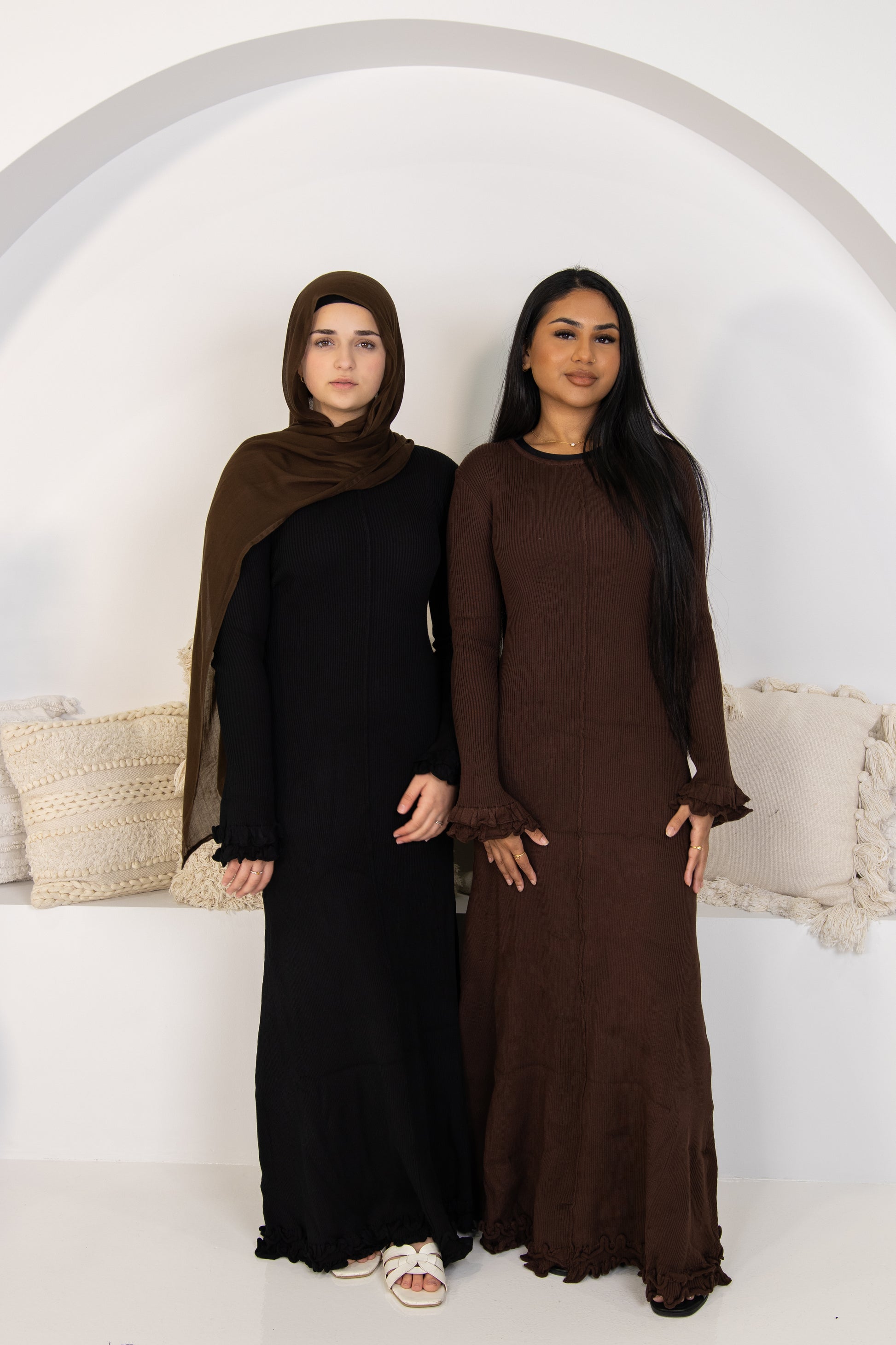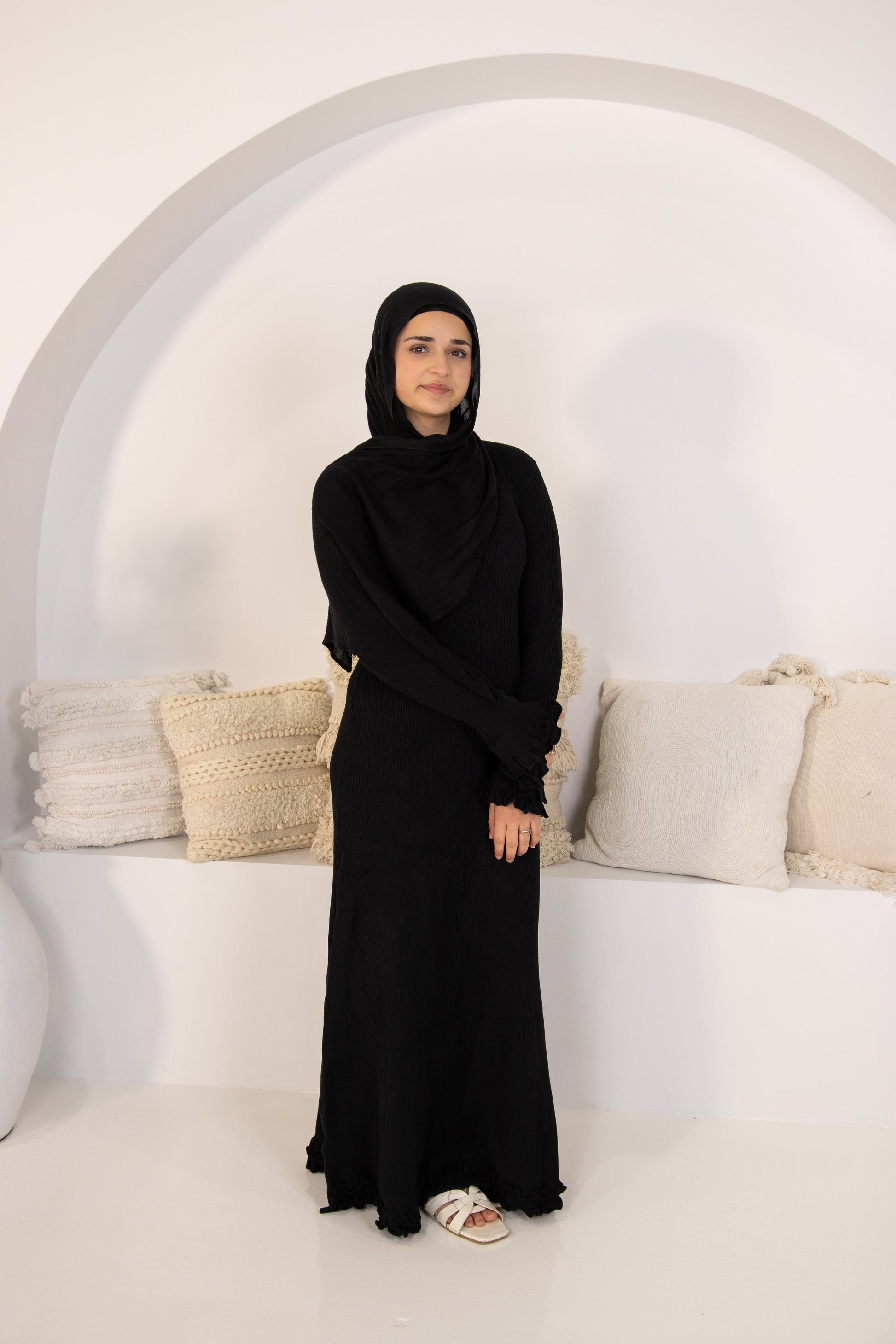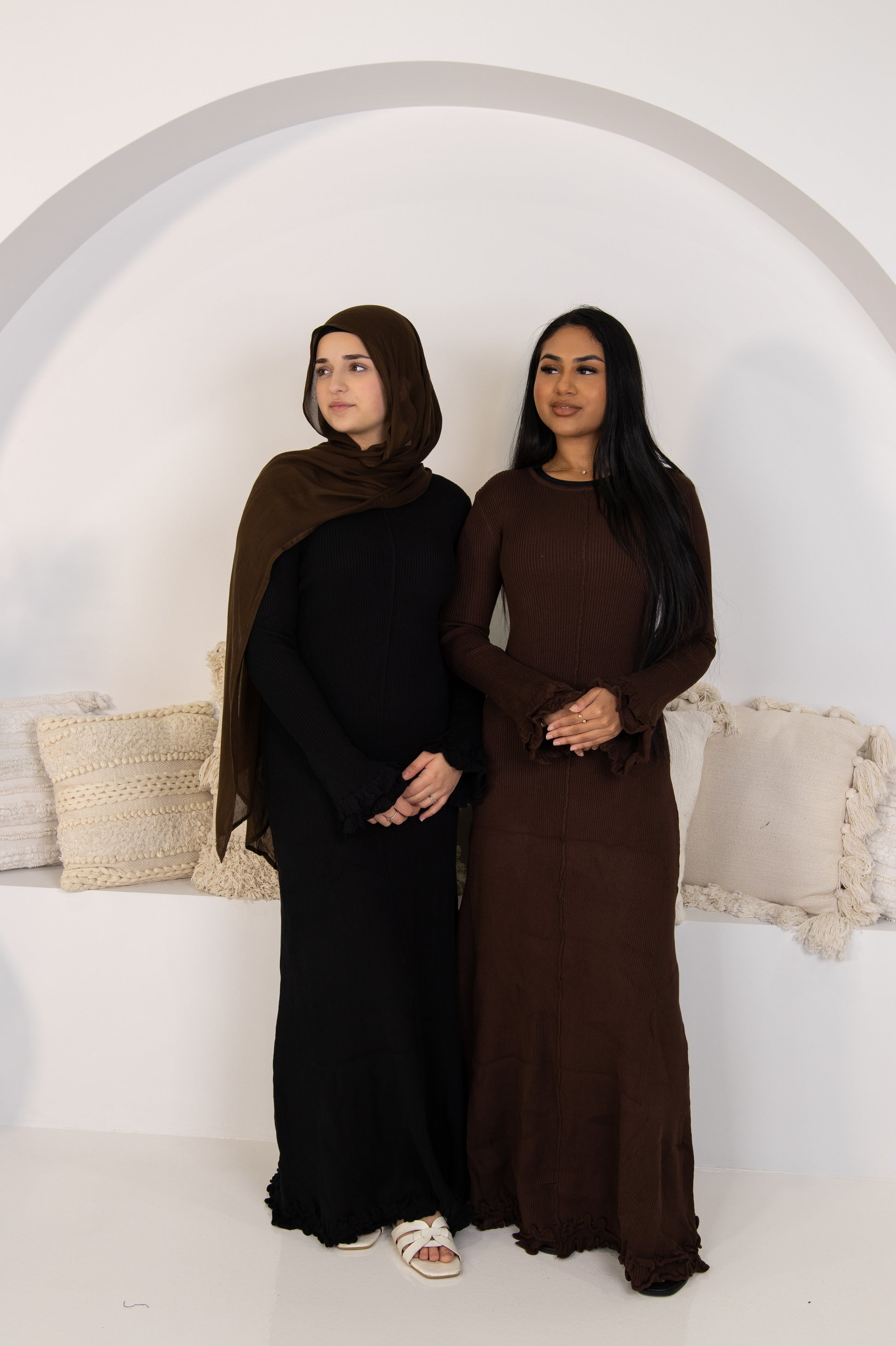 Make a graceful statement with our Twirl Dress—where timeless elegance meets effortless movement. This full-length dress features a softly fitted silhouette that gently flares at the hem and sleeves with delicate frill detailing, adding a romantic touch to every step. The subtle seam through the front creates a flattering shape while keeping the look sleek and modest.