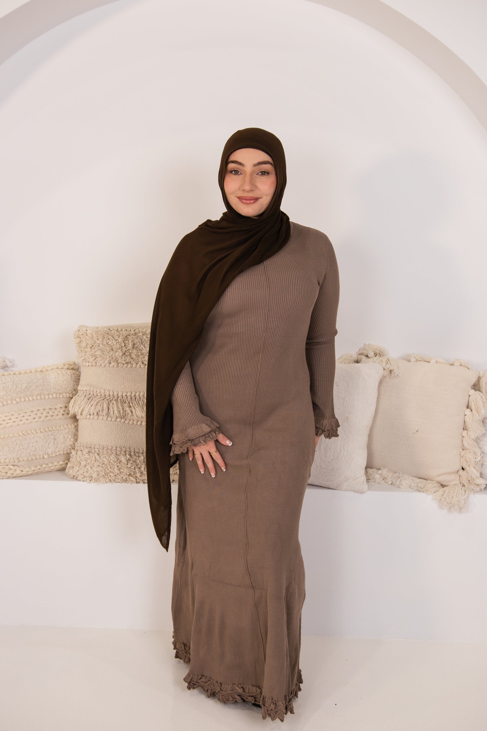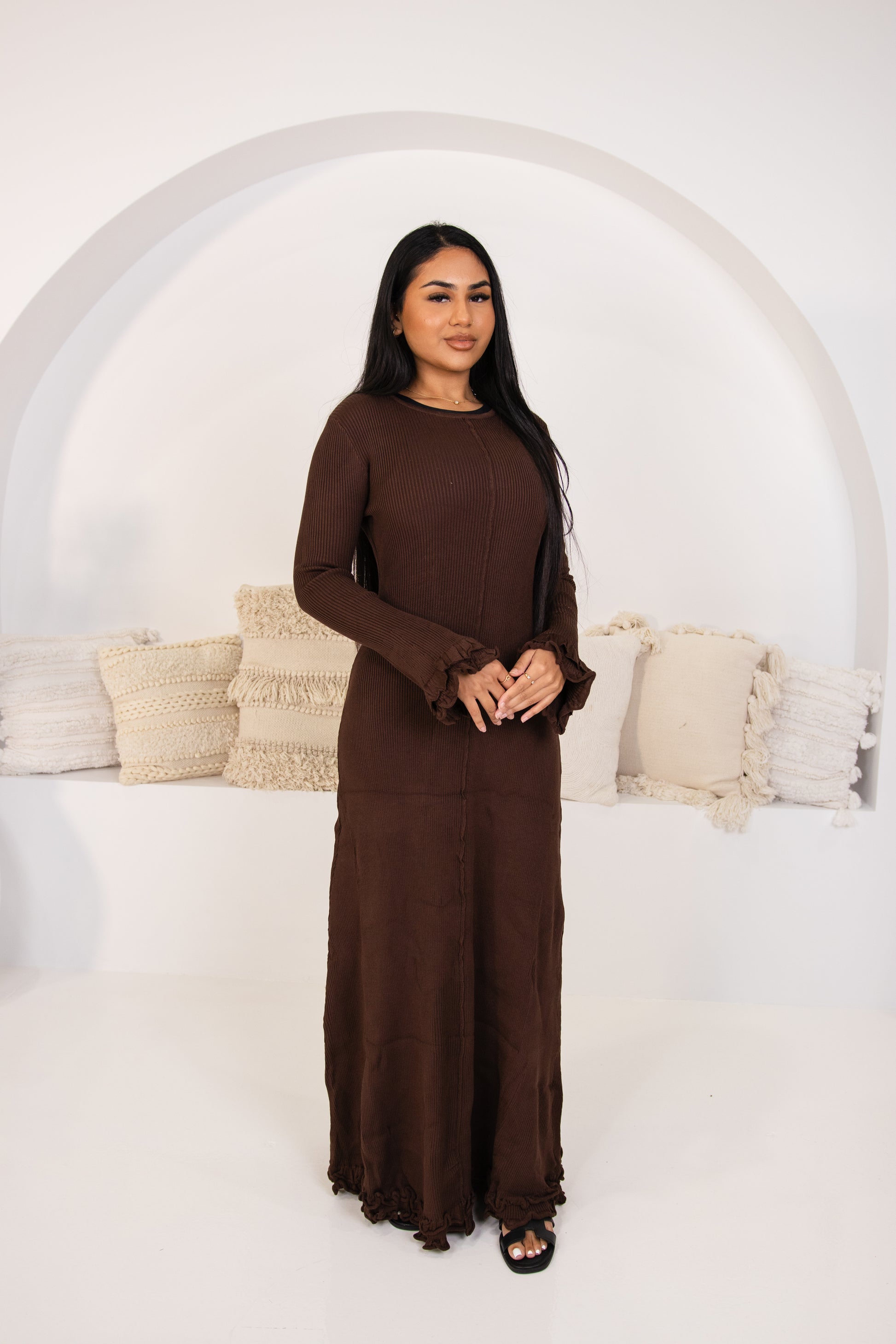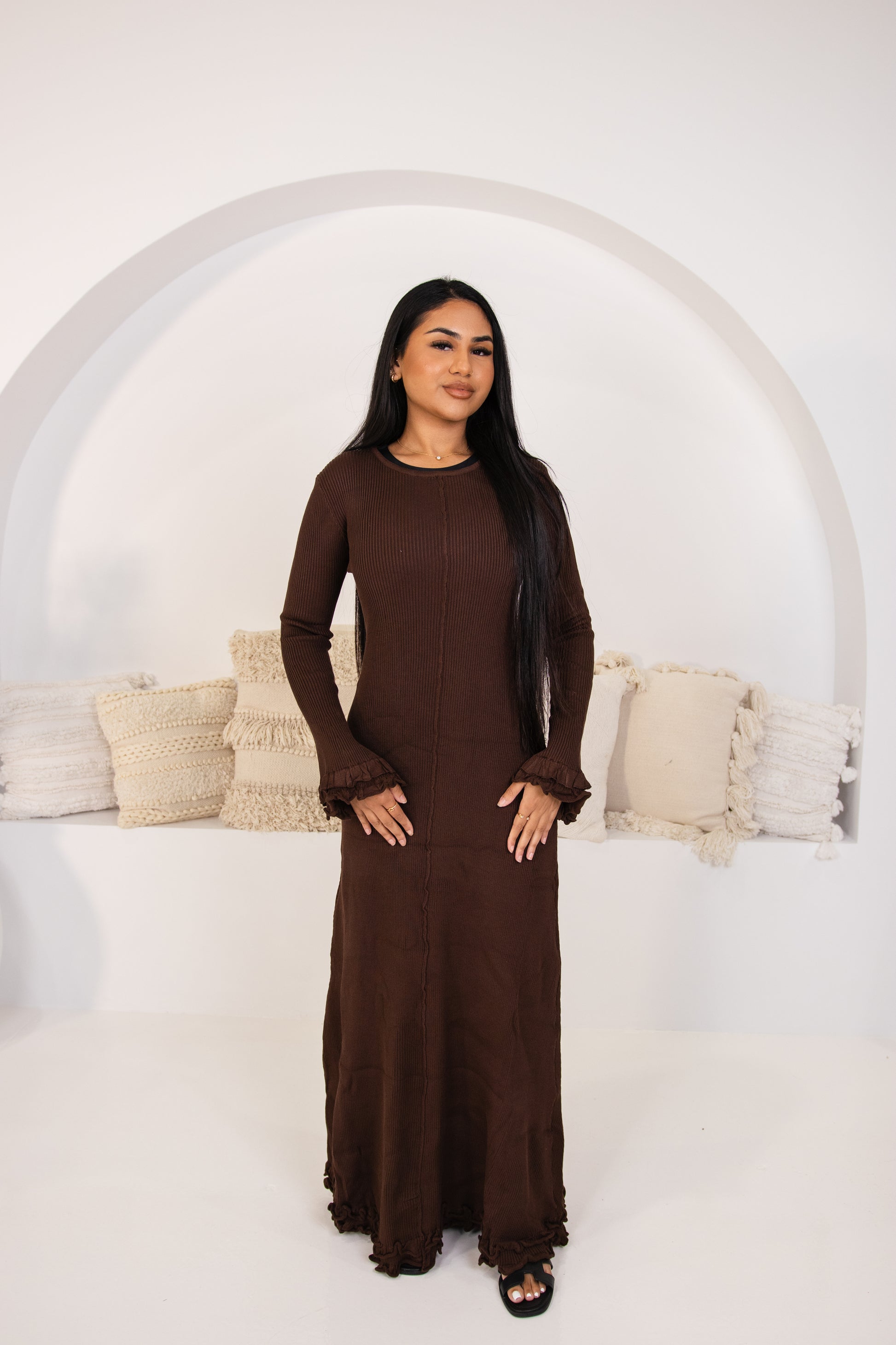 Make a graceful statement with our Twirl Dress—where timeless elegance meets effortless movement. This full-length dress features a softly fitted silhouette that gently flares at the hem and sleeves with delicate frill detailing, adding a romantic touch to every step. The subtle seam through the front creates a flattering shape while keeping the look sleek and modest.