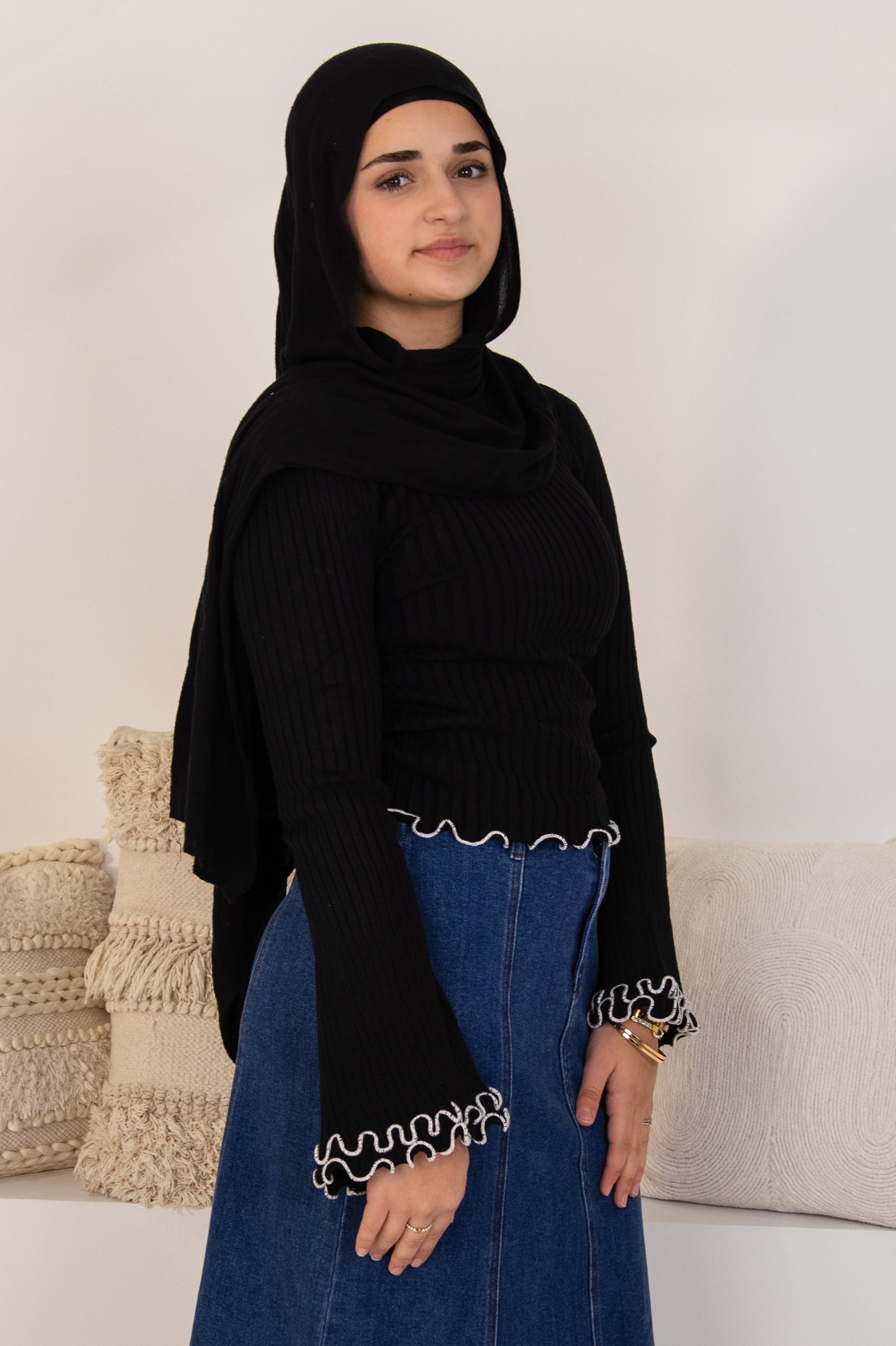 Add a playful twist to your winter wardrobe with our Twirl Flare Sleeves Knit Top—where comfort meets chic. Crafted from a soft, stretchy ribbed knit material, this fitted top hugs the body beautifully while offering just the right amount of structure and warmth.