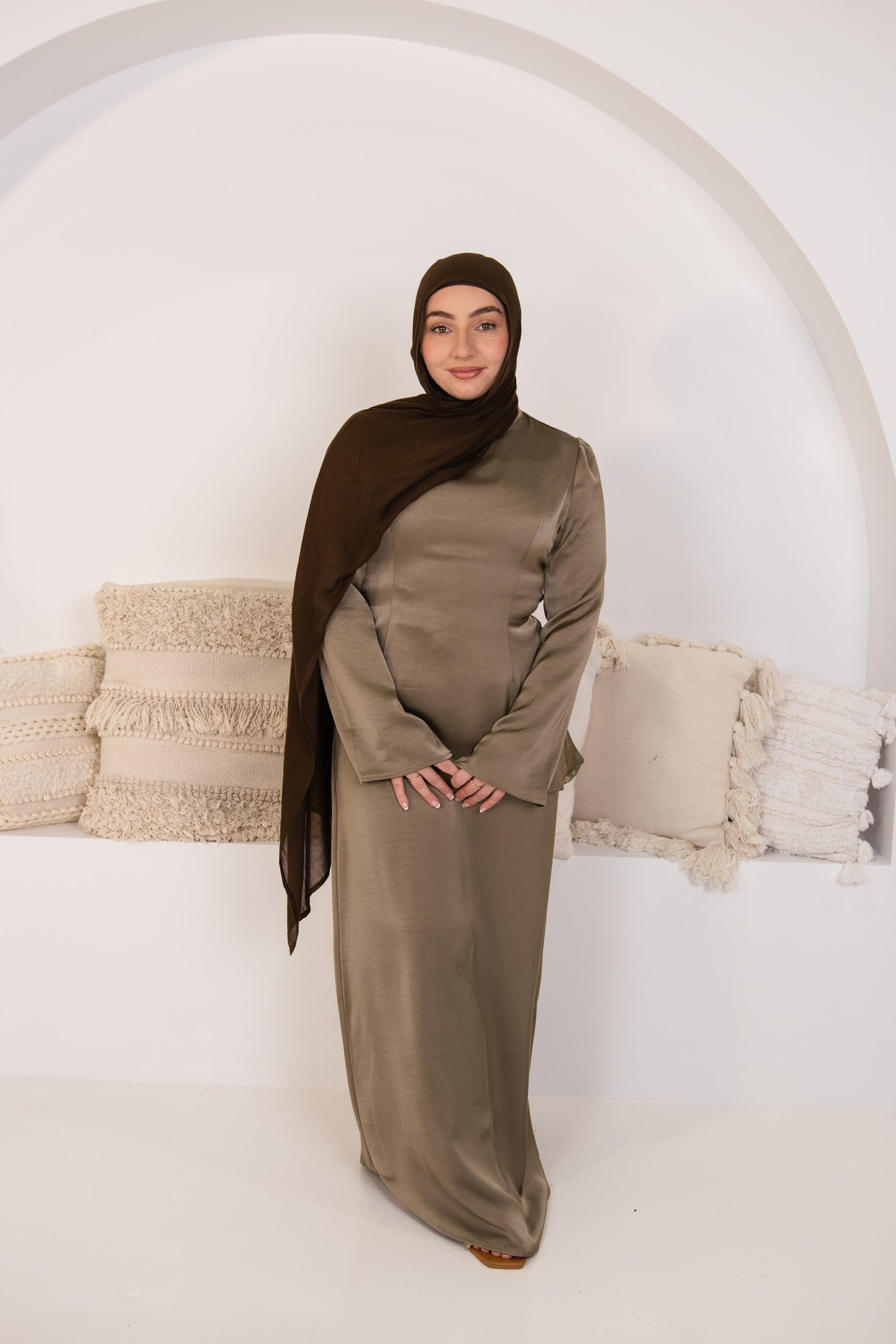 Available in olive green and taupe mocha.