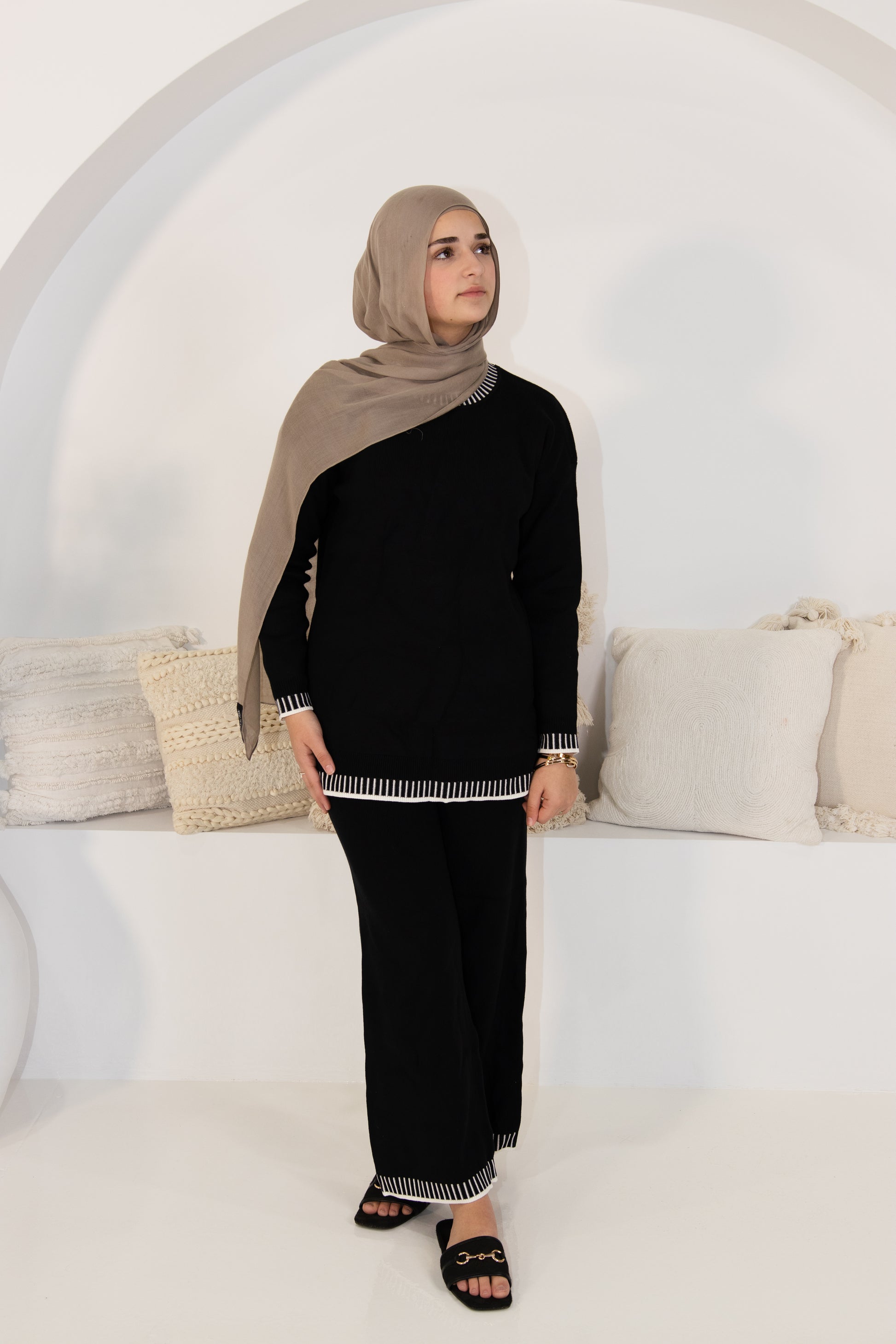 Crafted from a soft and breathable knit, this set is ideal for everyday wear, from casual outings to coffee catch-ups. The contrast trim adds a modern twist while maintaining a timeless, modest silhouette.
